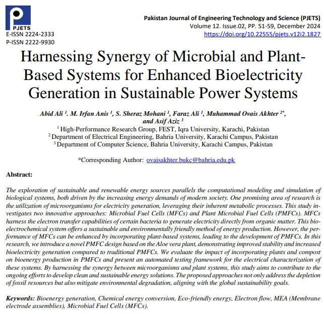 Harnessing Synergy of Microbial and Plant-Based Systems for Enhanced Bioelectricity Generation in Sustainable Power Systems. (2024). Pakistan Journal of Engineering, Technology and Science, 12(2), 65-73. https://doi.org/10.22555/pjets.v12i2.1187