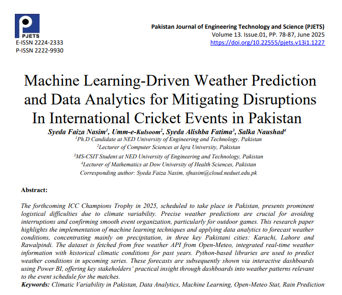 Predicting Weather Disruptions for the ICC Champions Trophy 2025 in Pakistan Using Machine Learning and Data Analytics. (2025). Pakistan Journal of Engineering, Technology and Science, 13(1), 78-87. https://doi.org/10.22555/pjets.v13i1.1227