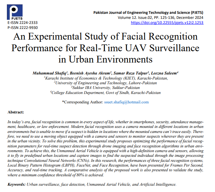 In today’s era, facial recognition is common in every aspect of life whether in smartphones, security, attendance management, healthcare, and law enforcement. Modern facial recognition uses a state-of-the-art camera mounted on each device, but we need to integrate it at a certain height for security purposes. To solve this problem, this article proposes real-time facial recognition through drone imaging for urban safety and surveillance. In this article, the Unmanned Aerial Vehicle is equipped with sensors and is allowed to fly in urban locations and capture images to find the suspected one through the image processing technique Convolutional Neural Networks (CNNs). In this research, performances of three facial recognition systems, Local Binary Pattern Histogram (LBPH), FaceNet, and Face_Recognition systems have been presented for Frames Per Second, Accuracy, and real-time tracking. A comparative analysis of the proposed work is also presented to validate the work where a minimum confidence threshold of 80% is achieved.
