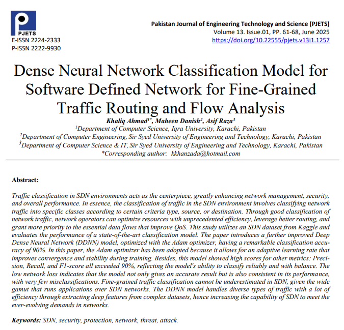 Dense Neural Network Classification Model for Software Defined Network for Fine Grained Traffic Routing and Flow Analysis . (2025). Pakistan Journal of Engineering, Technology and Science, 13(1), 61-68. https://doi.org/10.22555/pjets.v13i1.1257