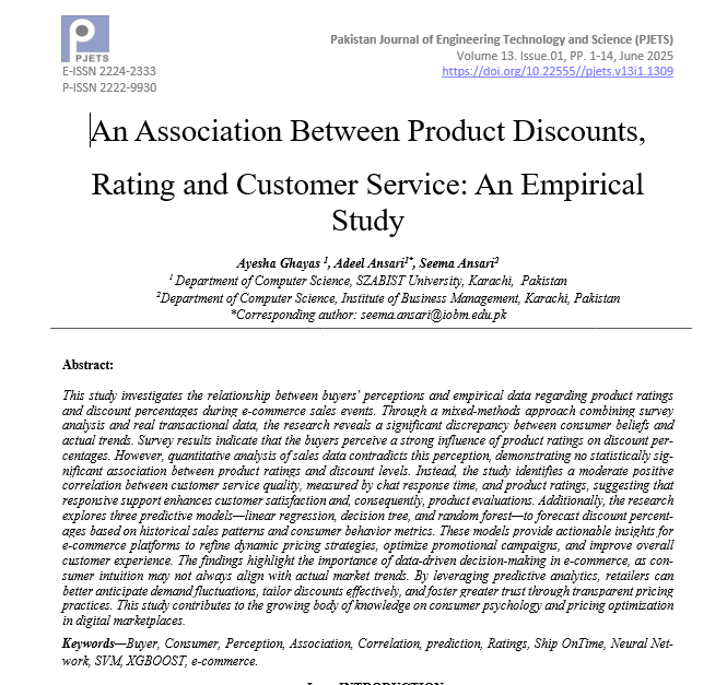 An Association Between Product Discount, Rating and Customer Service: An Empirical Study. (2025). Pakistan Journal of Engineering, Technology and Science, 13(1), 1-14. https://doi.org/10.22555/pjets.v13i1.1309
