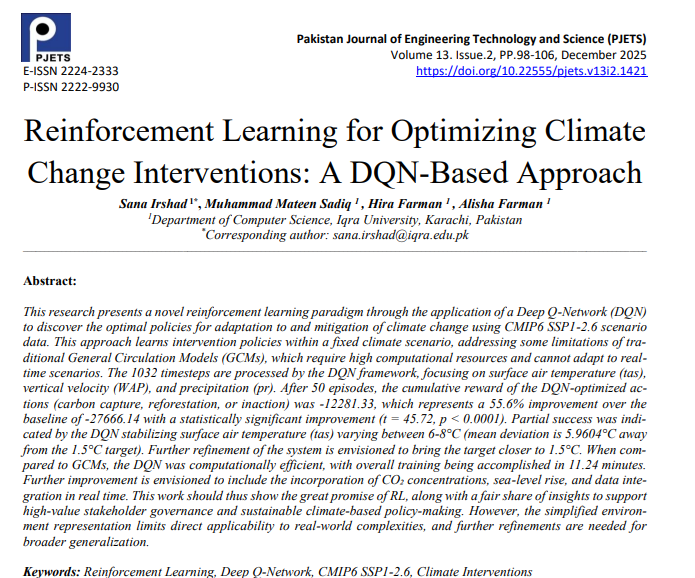 Reinforcement Learning, Deep Q-Network, Climate Simulations, CMIP6 SSP1-2.6, Climate InterventionsAbstract