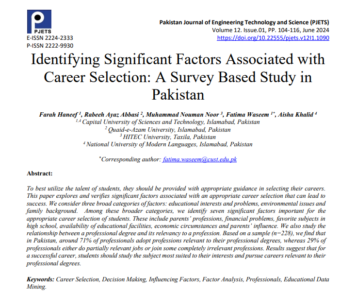 Identifying Significant Factors Associated with Career Selection: A survey based study in Pakistan